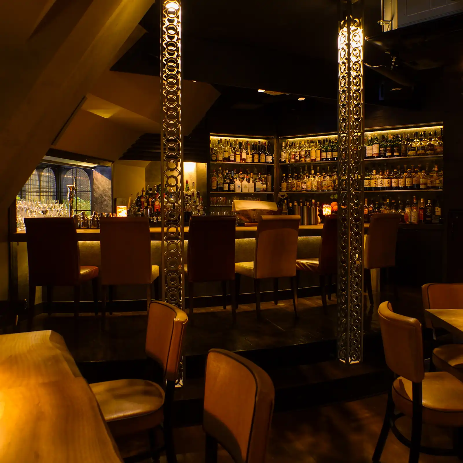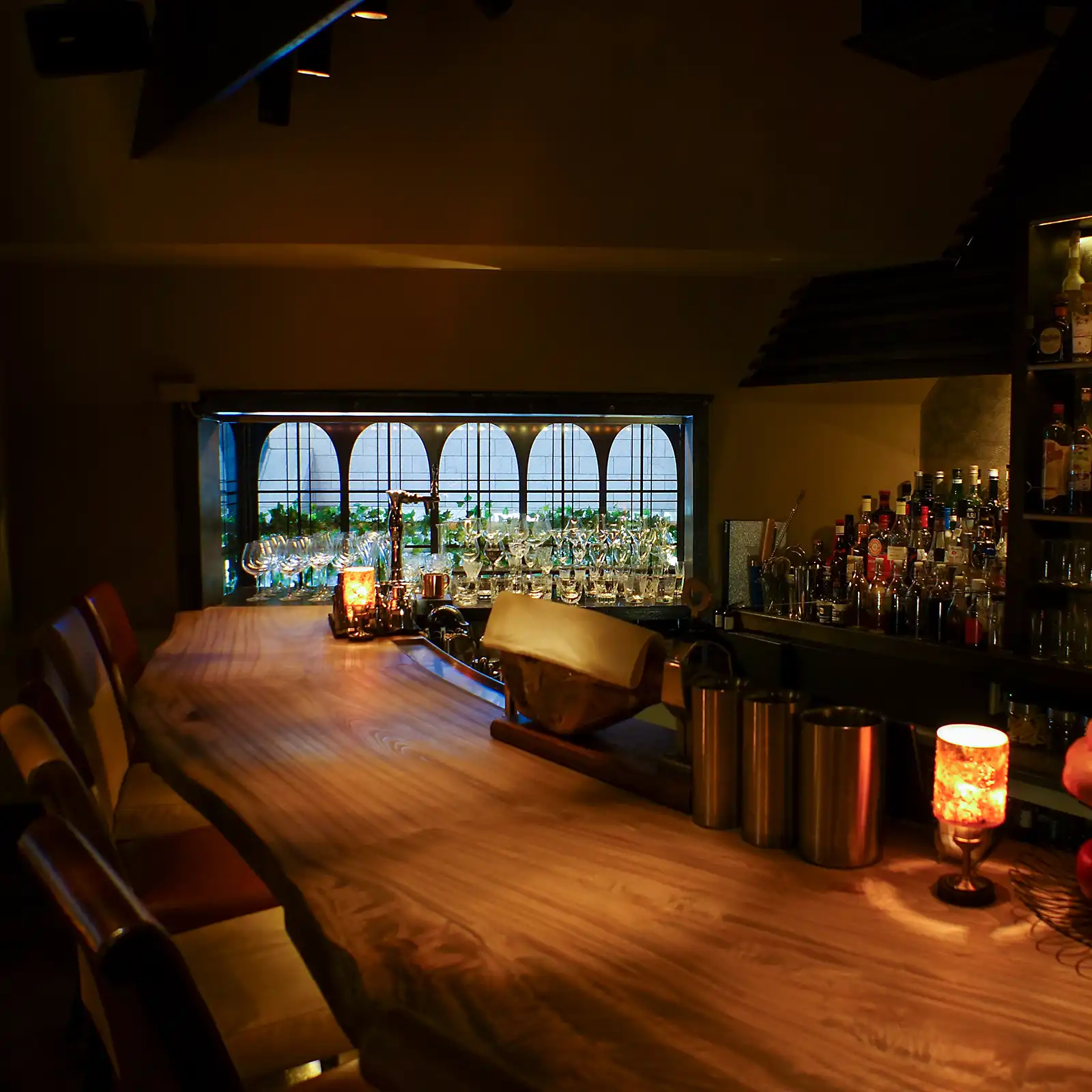 A space to savor drinks featuring solid wood counters and tables warm lighting and a rich sound system.